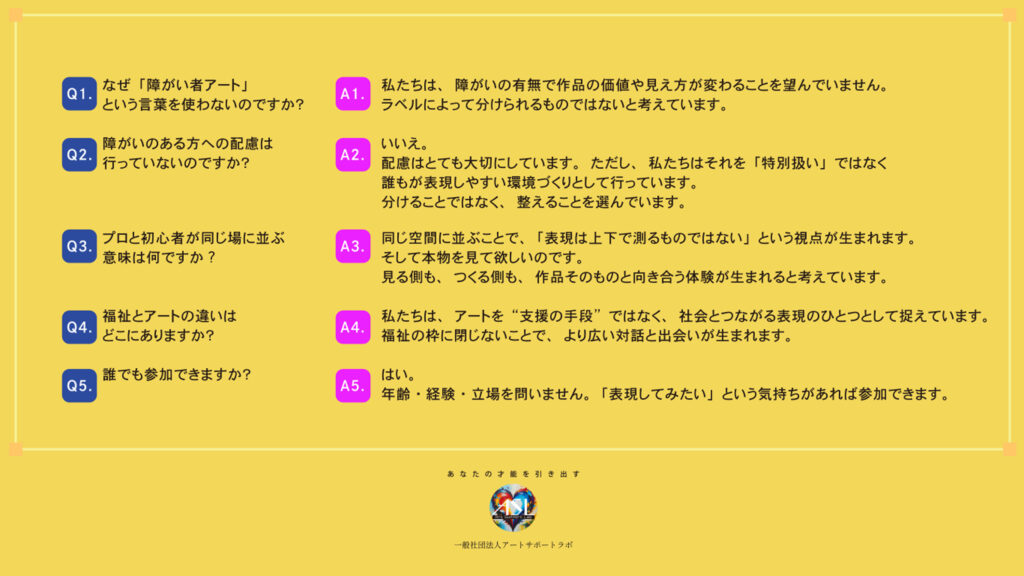 アートサポートラボは、「多様性を通じて新しい感情を創造し、一緒に未来を描く」ことを理念に